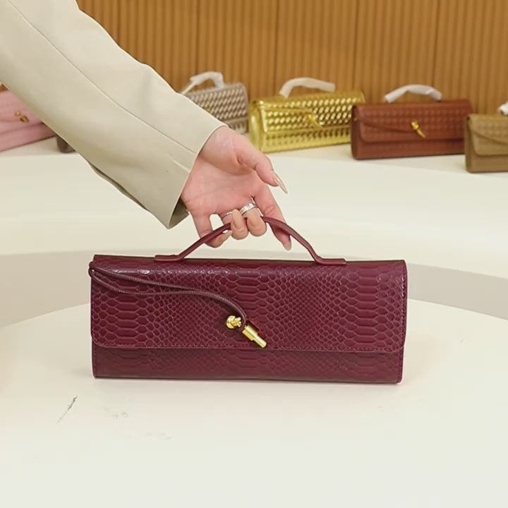 نقشة فاخرة وآسرة: تتميز المحفظة بنقشة جلد الأفعى البارزة والواضحة، التي تعكس الفخامة والذوق الجريء، وتجعلها قطعة مركزية ومميزة.